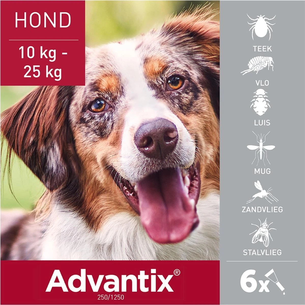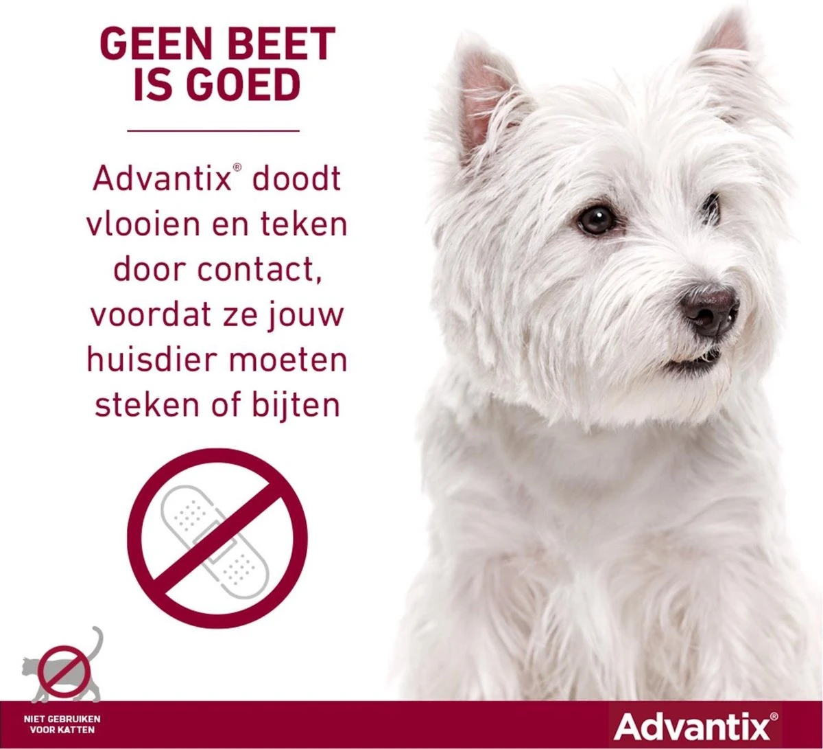 Advantix doodt vlooien en teken bij contact. Dat betekent dus dat je hond niet hoeft te worden gebeten voordat de werkzame bestanddelen hun werk doen. Advantix werkt ook tegen teken, muggen, zandvliegen en stalvliegen. Het middel is verkrijgbaar als waterbestendige spot-on behandeling voor kleine honden, grote honden en puppy’s vanaf 7 weken oud. Het is een eenvoudige oplossing waarmee je je huisdier tot 4 weken tegen parasieten beschermt.