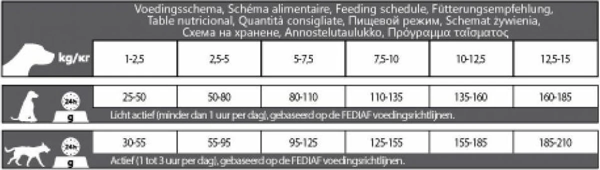 | Voedingswaarde | Granen, vlees en dierlijke bijproducten, oliën en vetten, plantaardige bijproducten, mineralen (natriumtripolyfosfaat 0,5%), zaden, gist |