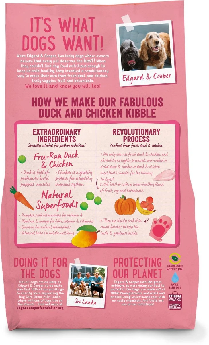 Dit recept is gemaakt voor kleine wildebrassen die barsten van energie. De onweerstaanbare mix van verse kip en eend is om poten, kom en baasje van af te likken: geen restjes dus! Natuurlijk doet Edgard & Cooper je pup ook echt goed. Eenden- en kippenvlees helpt bij de spieropbouw en versterkt het immuunsysteem. Omdat deze brokjes geen granen bevatten zijn ze ook helemaal oké voor pups met gevoelige maagjes.