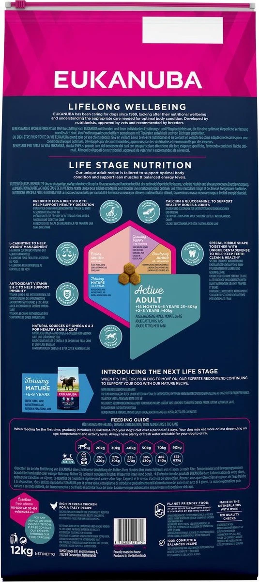 Eukanuba’s beste hondenvoer voor volwassen grote rassen, aanbevolen voor grote honden zoals Duitse herders, labradors, rottweilers en golden retrievers, is samengesteld met een verlaagd vetgehalte dat het behoud van een optimaal gewicht bevordert om de gewrichten te ontlasten. Verder bevat het natuurlijke bronnen van glucosamine en chondroïtinesulfaat voor gezonde gewrichten. Eukanuba Adult droog hondenvoer voor grote rassen bevat hoogwaardige dierlijke eiwitten (kip is het belangrijkste ingrediënt), vetten, koolhydraten, vezels en belangrijke vitaminen en mineralen voor de gezondheid en het welzijn van uw volwassen hond van een groot of zeer groot ras. Het voer is ontwikkeld in samenwerking met dierenartsen en wordt aanbevolen door topfokkers om uw hond een 100% volledig en uitgebalanceerd dieet te geven. Ieder dieet van Eukanuba Adult droge hondenvoeding bevat de 3D DentaDefense-technologie en reinigt daardoor met iedere hap, vermindert de opbouw van tandsteen tot wel 80%* en helpt uw hond een gezond gebit te houden.