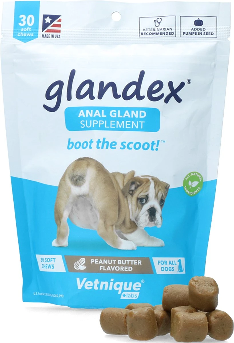 Een veel voorkomend probleem bij honden zijn volle en/of geirriteerde anaalklieren. Glandex soft chews zijn speciaal ontwikkeld om anaalklierproblemen bij honden tegen te gaan. Bij iedere ontlasting komt er een beetje inhoud uit de anaalklieren mee naar buiten en op deze manier worden de problemen minder of verdwijnen helemaal.