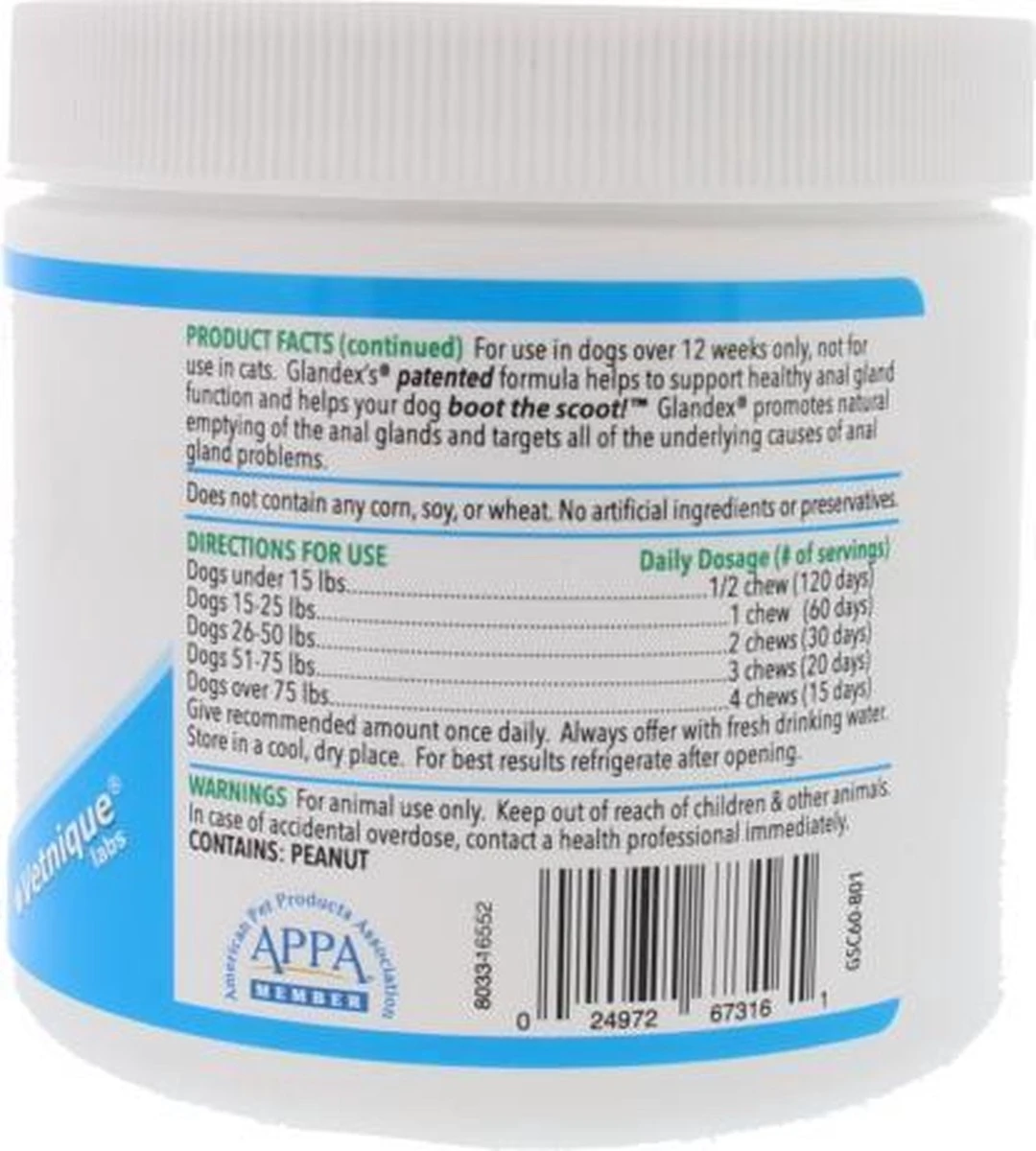 Een veel voorkomend probleem bij honden zijn volle en/of geirriteerde anaalklieren. Glandex soft chews zijn speciaal ontwikkeld om anaalklierproblemen bij honden tegen te gaan. Bij iedere ontlasting komt er een beetje inhoud uit de anaalklieren mee naar buiten en op deze manier worden de problemen minder of verdwijnen helemaal.