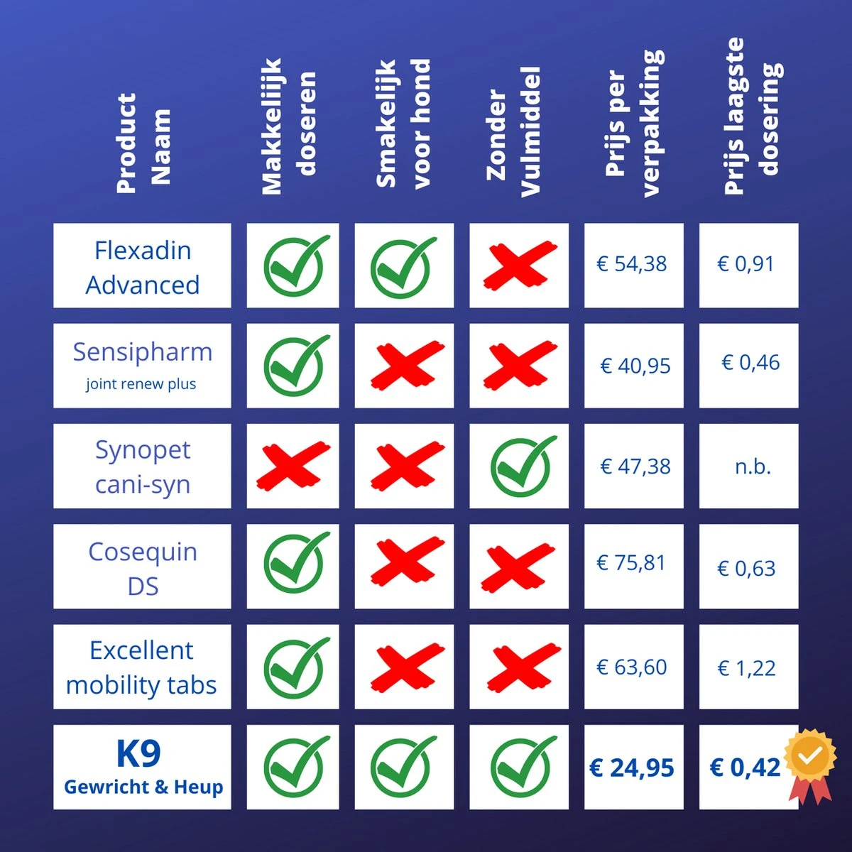 Wondermiddelen bestaan niet en het is niet toegetsaan om medische claims te maken voor (diervoeder)supplementen. Wat onze klanten betreft, vooral baasjes met oudere honden, komt dit supplement er wel heel dichtbij in de buurt als we afgaan op hun positieve reacties en reviews!