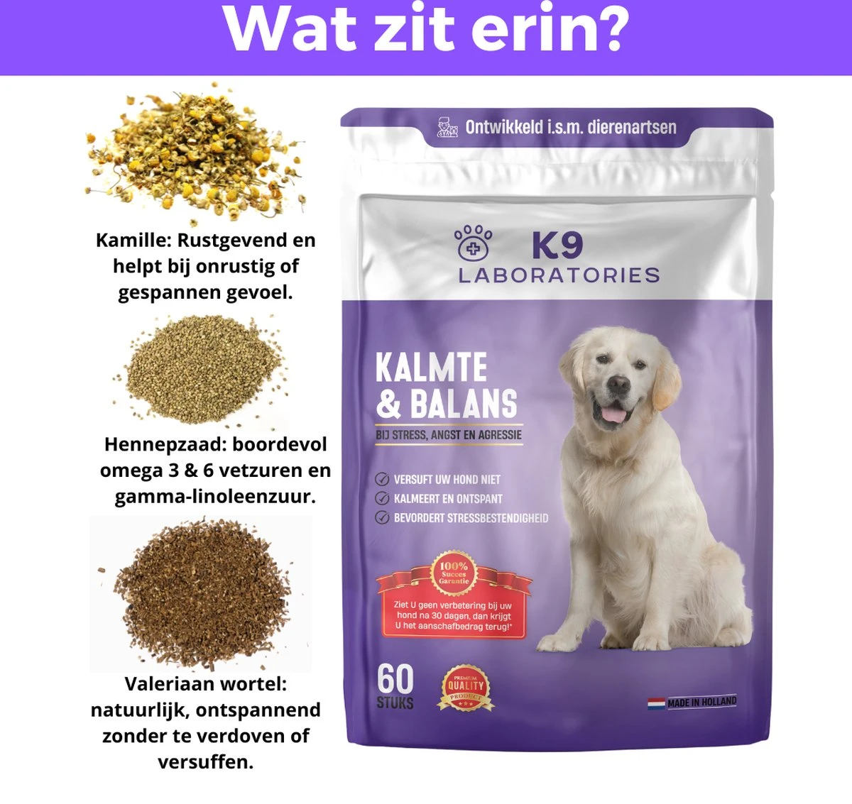 K9 Laboratories – Kalmte & Balans – Supplement – Voor Honden – Tegen Angst – Stress – Agressie – L-tryptofaan – Valeriaan – Hennepzaadolie – 60 Stuks – Voor Een Rustige Hond