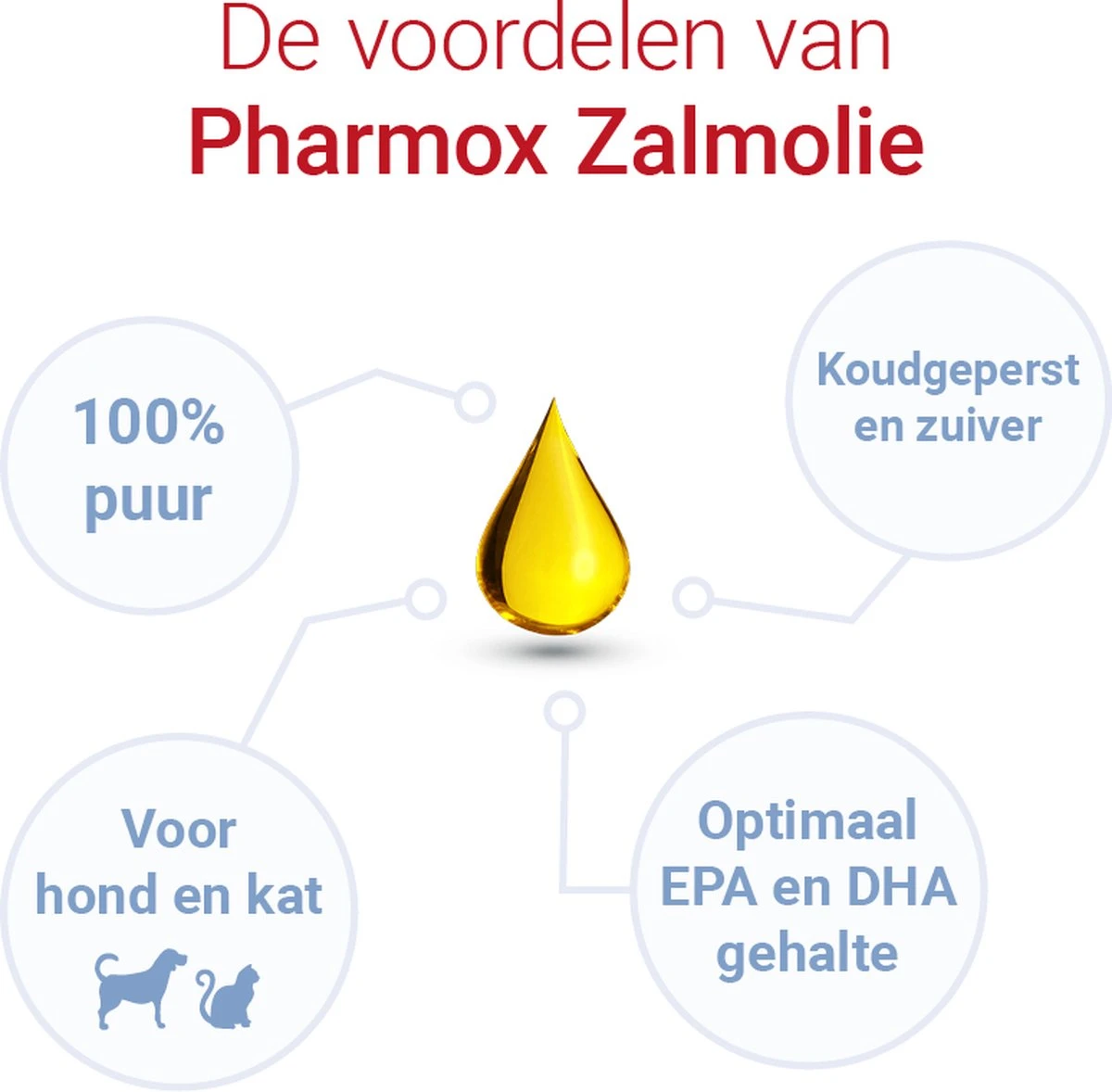 Pharmox Zalmolie 100% Puur is zowel voor jongere als oudere honden en katten aan te raden. De zalmolie is met zorg geselecteerd op zuiverheid en kwaliteit. Het productieproces vindt plaats onder strenge richtlijnen. Met Pharmox haal je gegarandeerd kwaliteit in huis voor je trouwe viervoeters.