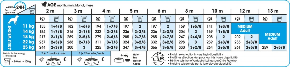 Waarborgt een harmonieuze groei. Komt tegemoet aan de snelle groei, terwijl de verteringscapaciteit van de pup nog beperkt is; dankzij een hoog energiegehalte (4190 kcal/kg, gemeten energie) en een hoog eiwitgehalte (32%).