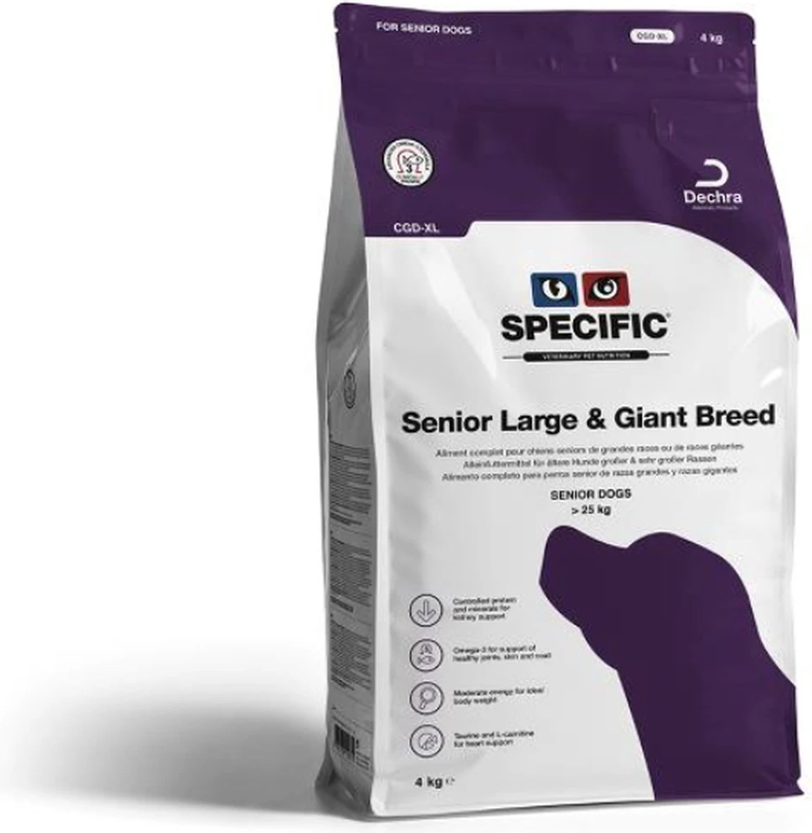 Door een dieet te geven, rijk aan omega 3 vetzuren uit vis en met een verlaagd eiwit, fosfor en natrium gehalte, wordt de achteruitgang van de nieren zoveel mogelijk vertraagd. Specific Senior Large & Giant Breed CGD-XL voldoet aan deze eis en ondersteunt daarnaast ook het hart, de spijsvertering, de gewrichten, de huid en vacht en zorgt voor het behoud van een ideaal gewicht. Het is de volmaakte voeding voor uw seniore hond. Specific Senior Large & Giant Breed CGD-XL kan ook gegeven worden in combinatie met de natvoeding variant Specific Senior All Breeds CGW.