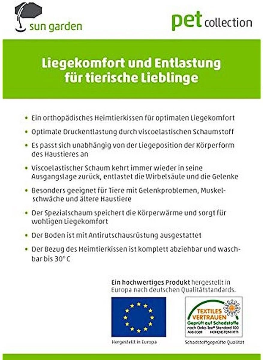 Het Duitse bedrijf Sun Garden, bekend van o.a. kwaliteitsmatrassen en boxsprings heeft nu ook luxe kleden en (orthopedische) kussens voor huisdieren ontwikkeld. Uw hond kan heerlijk ontspannen liggen op het orthopedisch hondenkussen Buddy. Het kussen geeft een optimale drukontlasting voor de wervelkolom en de gewrichten. • Orthopedisch hondenkussen voor optimaal ligcomfort